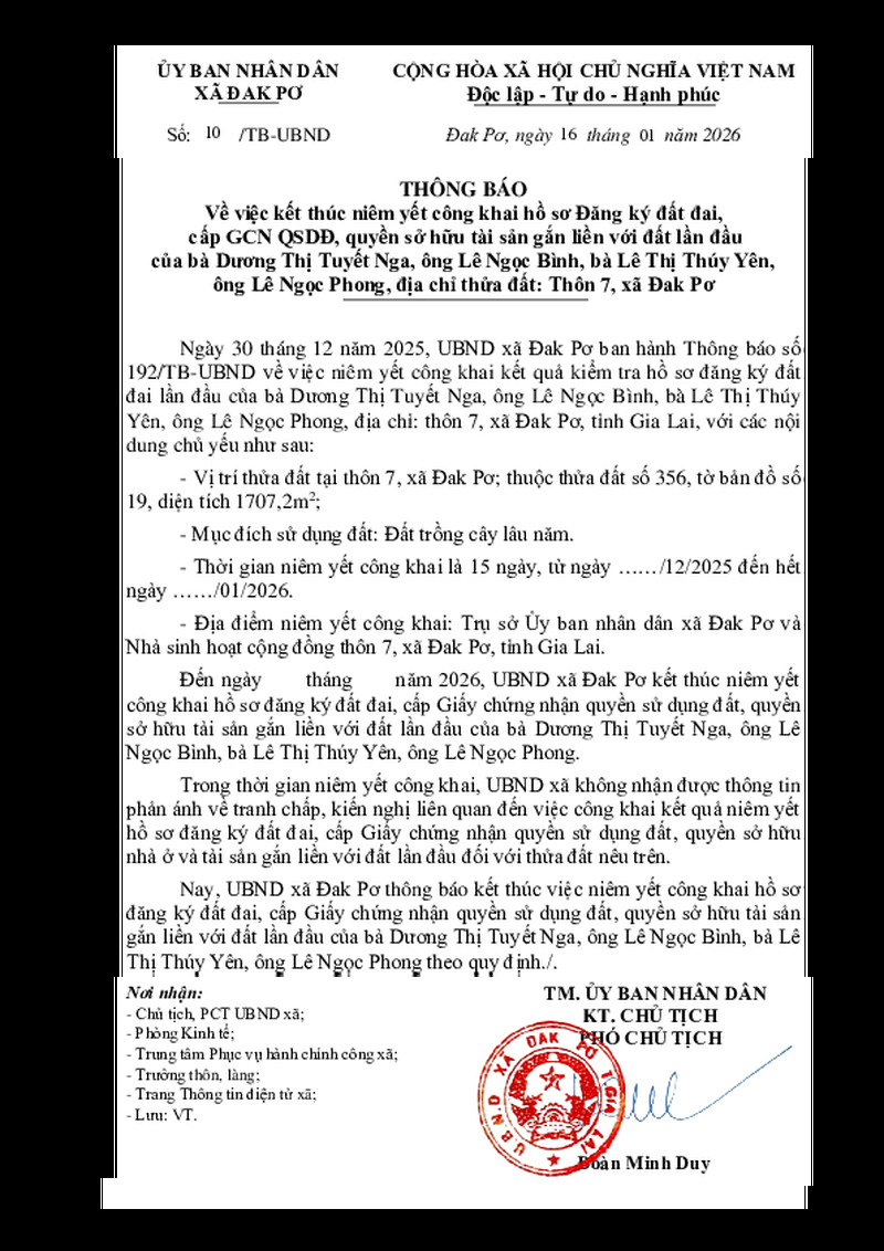 | Tiêu đề văn bản | TB kết thúc niêm yết công khai hồ sơ Đăng ký đất đai, cấp GCN QSDĐ, quyền sở hữu tài sản gắn liền với đất lần đầu của bà Dương Thị Tuyết Nga, ông Lê Ngọc Bình, bà Lê Thị Thúy Yên, ông Lê Ngọc Phong, địa chỉ thửa đất: Thôn 7, xã Đak Pơ | ||